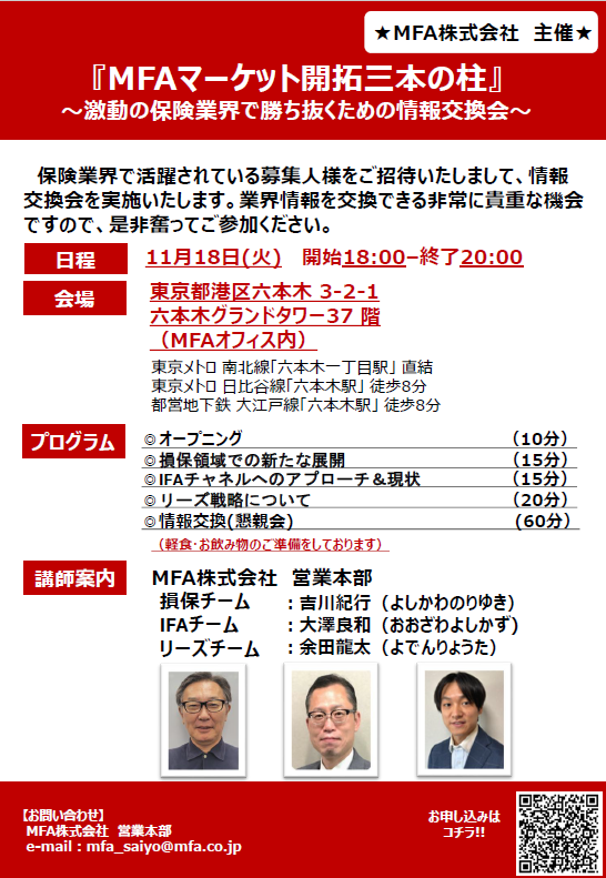 | 名 称 | ~激動の保険業界で勝ち抜くための情報交換会~ 「MFAマーケット開拓3本の柱」 |